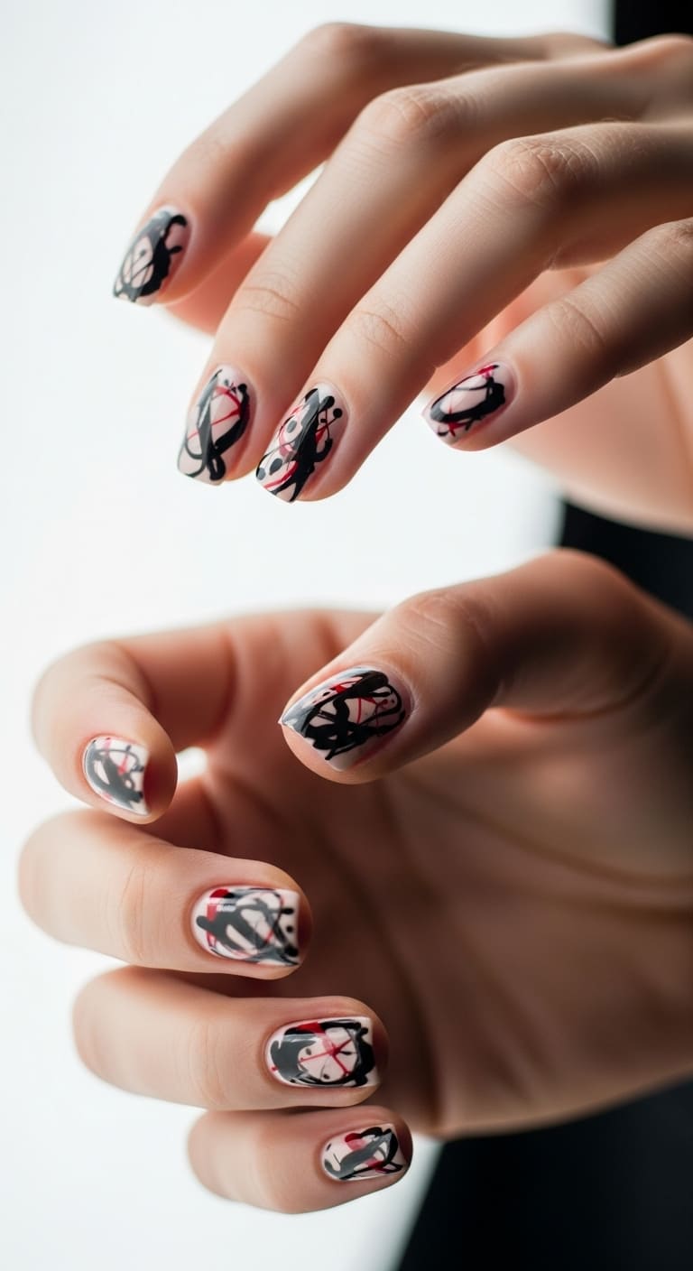Embrace your inner artist with abstract designs that look complicated but are actually incredibly forgiving. Use a toothpick or thin brush to create random swirls, splatters, or brush strokes in black and red over a neutral or white base.