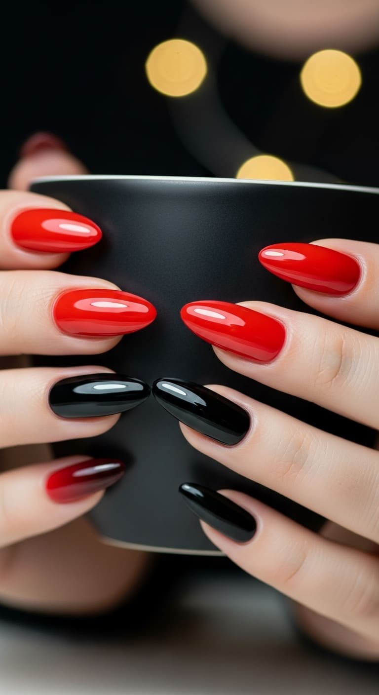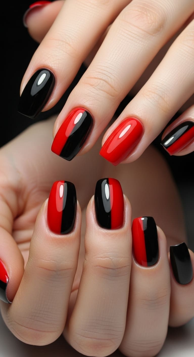 Let’s start with a timeless favorite that never goes out of style. The half-and-half design splits each nail vertically or horizontally, with one half painted black and the other red. This geometric approach creates a striking visual impact that’s surprisingly easy to achieve at home with steady hands and some striping tape.
