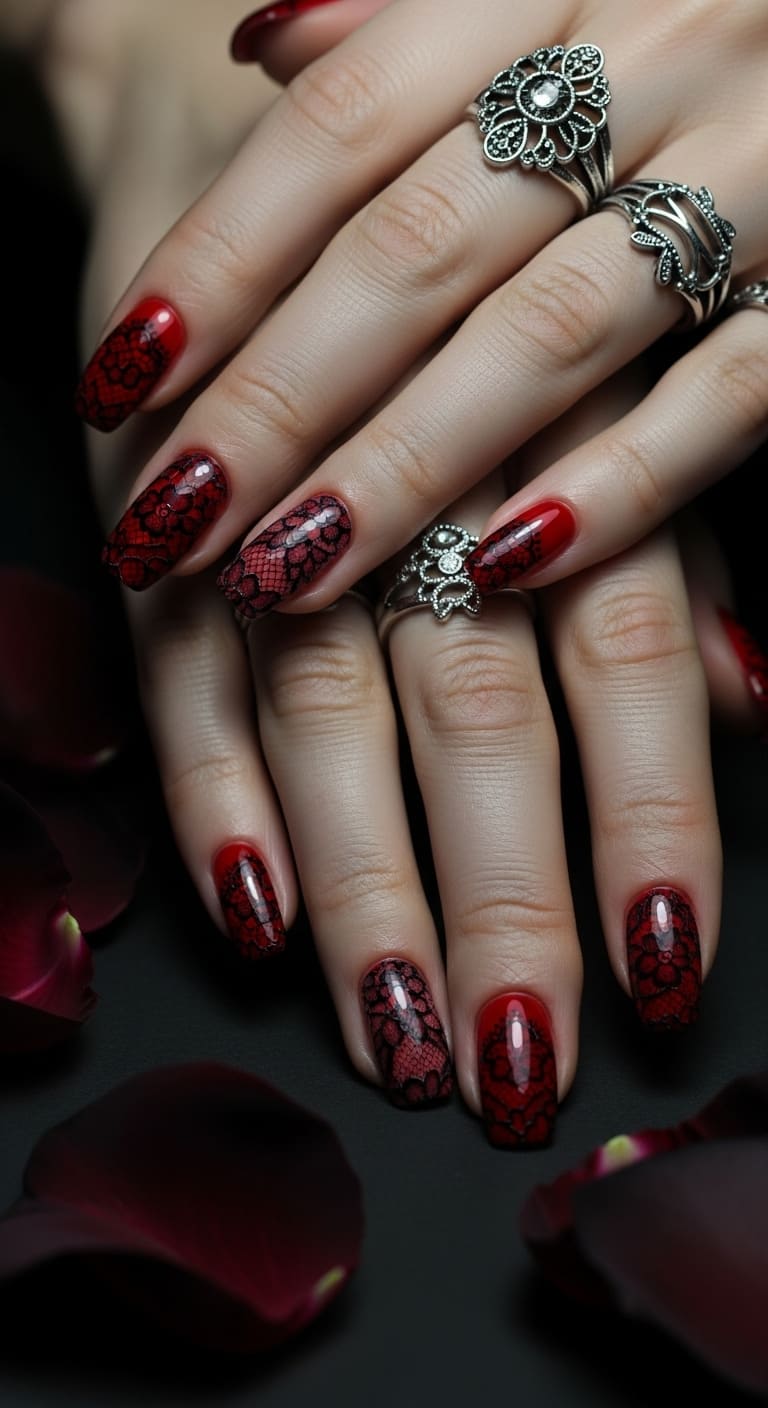 Channel your inner romantic with delicate black lace patterns over a red base. You can use lace nail stickers, stamping plates, or if you’re feeling ambitious, paint the intricate designs freehand with a thin nail art brush.