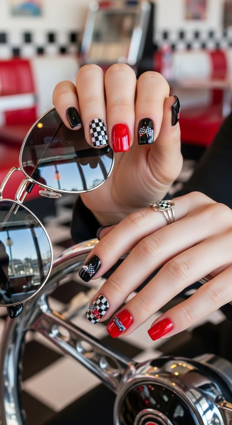 Bring some retro energy to your fingertips with a checkered pattern that combines black and red squares. This playful design nods to racing flags and vintage diners, giving you an edgy, rockabilly vibe that’s totally on-trend.