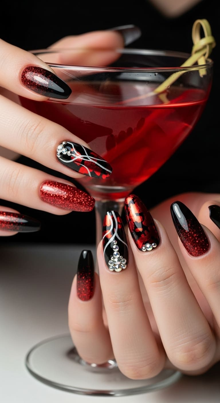 Add some glitter or metallic accents to your black and red palette for instant glamour. A red glitter fade over black creates a smoldering effect, while gold or silver foil accents complement both colors beautifully.