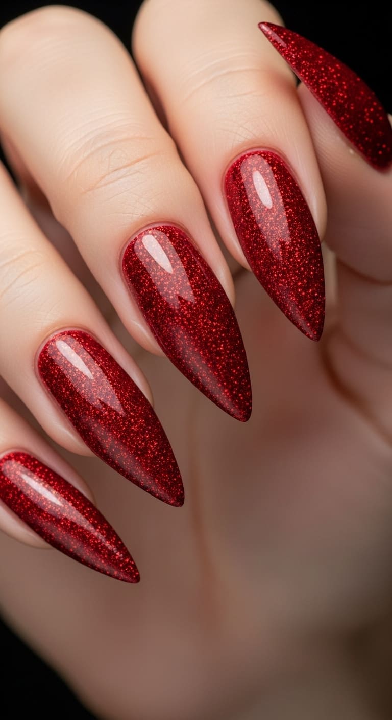 Bold, dramatic, and unapologetically fierce—that’s what you get with stiletto nails drenched in red glitter. The elongated, pointed shape naturally creates a striking silhouette, and coating them entirely in sparkly red takes the drama to another level.