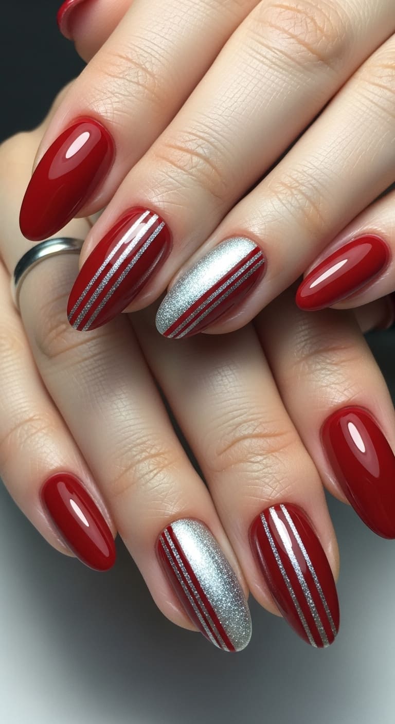 Mixing silver glitter with red creates a cool-toned contrast that feels fresh and contemporary. Paint your nails a bright cherry red, then add thin vertical stripes of silver glitter down the center or along the sides.