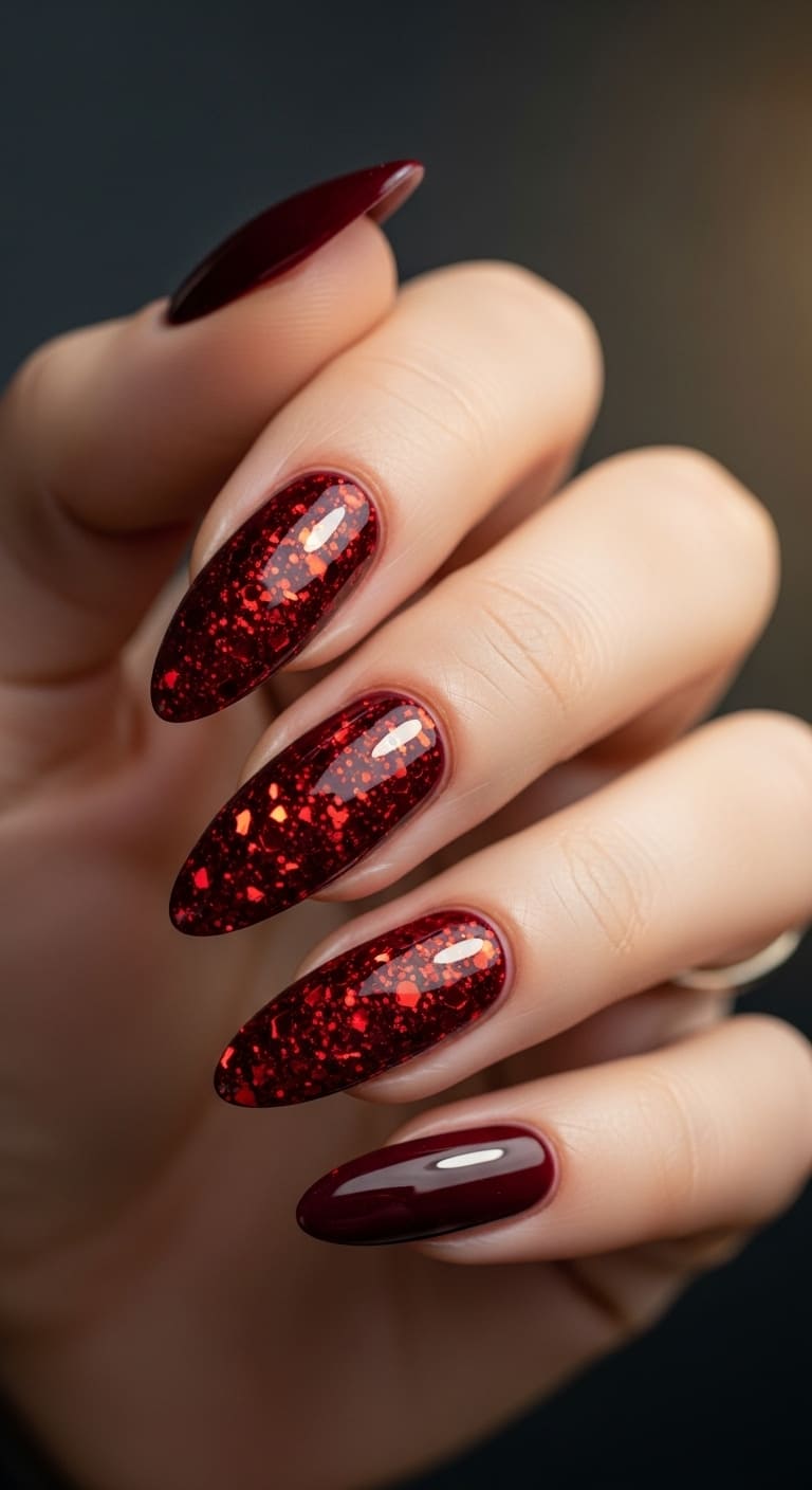 You can rotate which finger gets the glitter treatment, or do one accent nail on each hand. Experiment with different red shades—try a cherry red base with a burgundy glitter accent, or vice versa, to create subtle depth and interest.