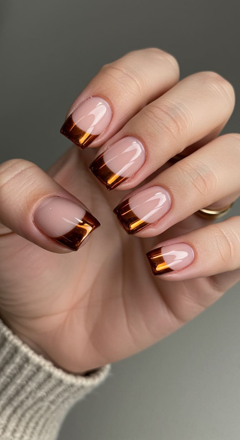 Combine a shiny caramel‑brown chrome tip with a glossy nude base for a high‑end finish. Chrome powders are beginner‑friendly and forgiving on short tips. Quick tip: gently buff with chrome powder after base coat but before top coat.