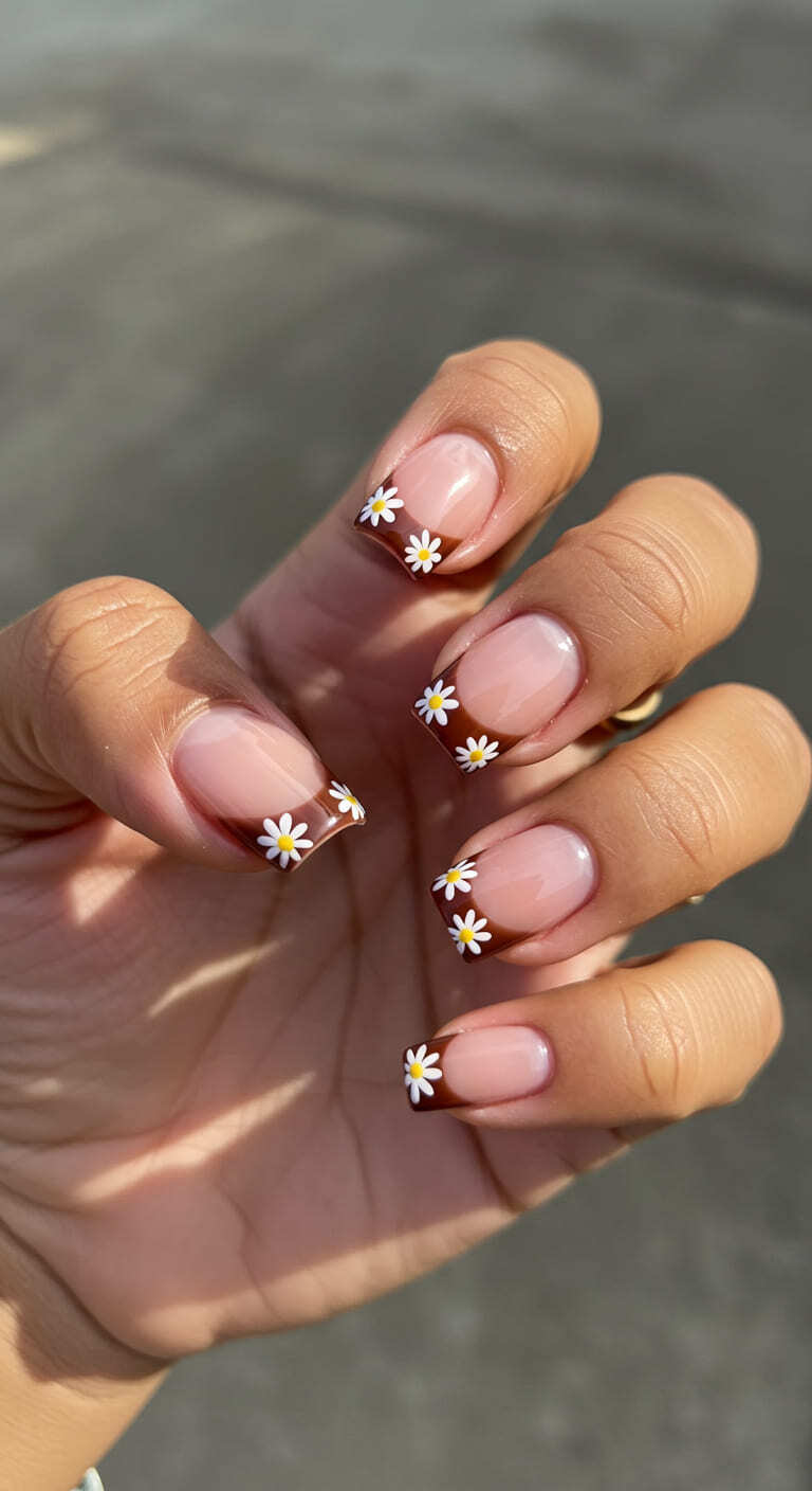 7. Brown French Tip with Tiny White Florals