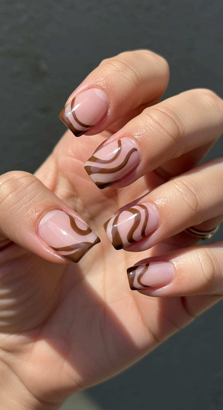 Simple mocha‑brown swirl across the tip adds unique character without needing freehand art. A dot of polish and a toothpick swirl is all it takes. Ideal for short nails since the swirl fits within a small canvas.