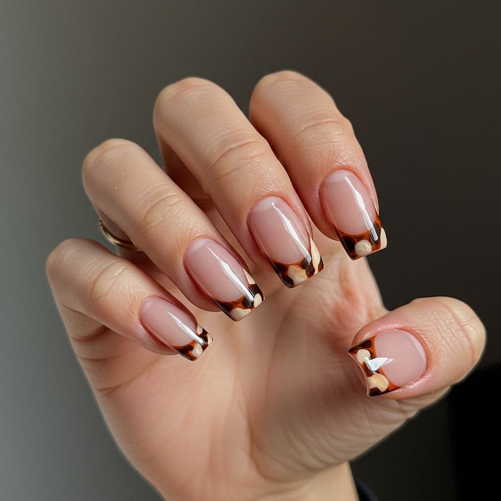 Mini tortoiseshell tips in cream/brown over a clear base offer trendy pattern work in small doses. Use a thin brush to dab spots of brown/tan and connect slightly for that effect. Great for short nails since tips remain prominent.
