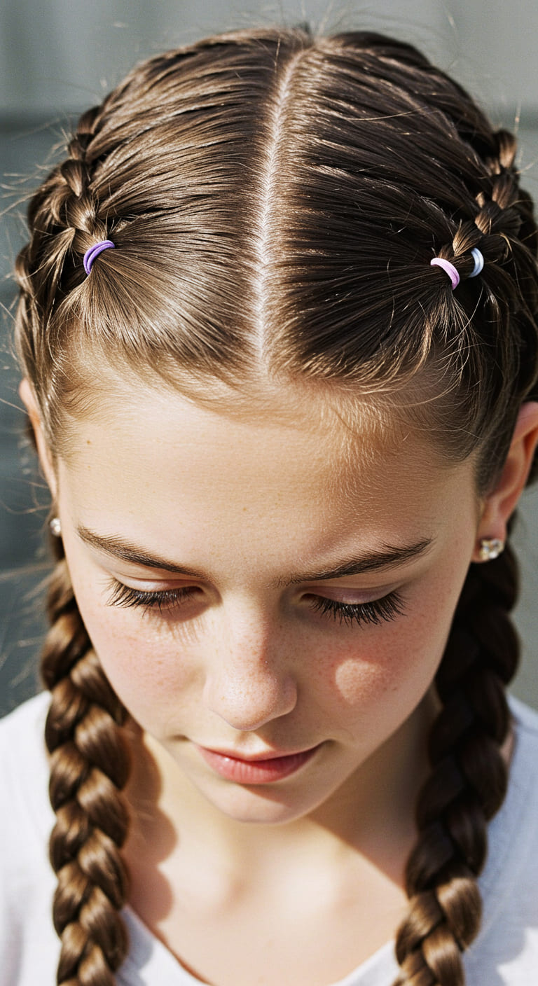 This style works for all hair lengths and textures and can be finished off with simple ties or twisted into mini buns for extra hold. A little styling gel at the roots helps reduce flyaways.