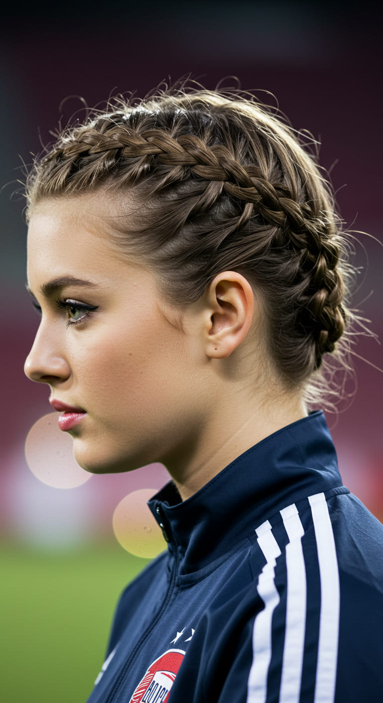 This style wraps your hair into a crown-like braid that circles your head—a regal look with serious hold. It’s perfect for long games because it doesn’t budge and adds a cute twist to traditional braids.