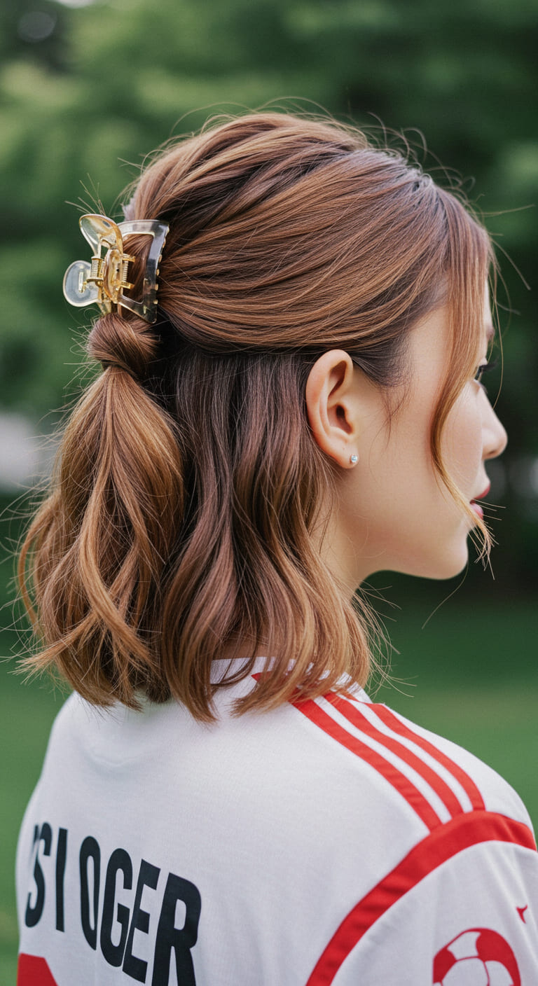 For a playful look that still keeps the hair out of your face, go for a half-up twisted section held with a claw clip. Twist small sections from each side toward the back and clip them together, leaving the rest down or lightly waved.
