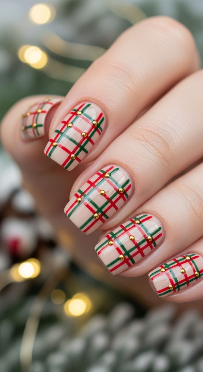 You can start with a white or beige base color, then use a thin nail art brush or striping tape to create intersecting lines in forest green and cranberry red, finishing with tiny gold dots at the intersections for extra polish.