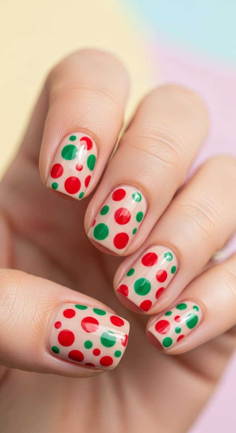 Cheerful polka dots in red and green scattered across a neutral base bring whimsy and joy to your fingertips. This retro-inspired design feels both nostalgic and fresh, perfect for anyone who loves a playful manicure.