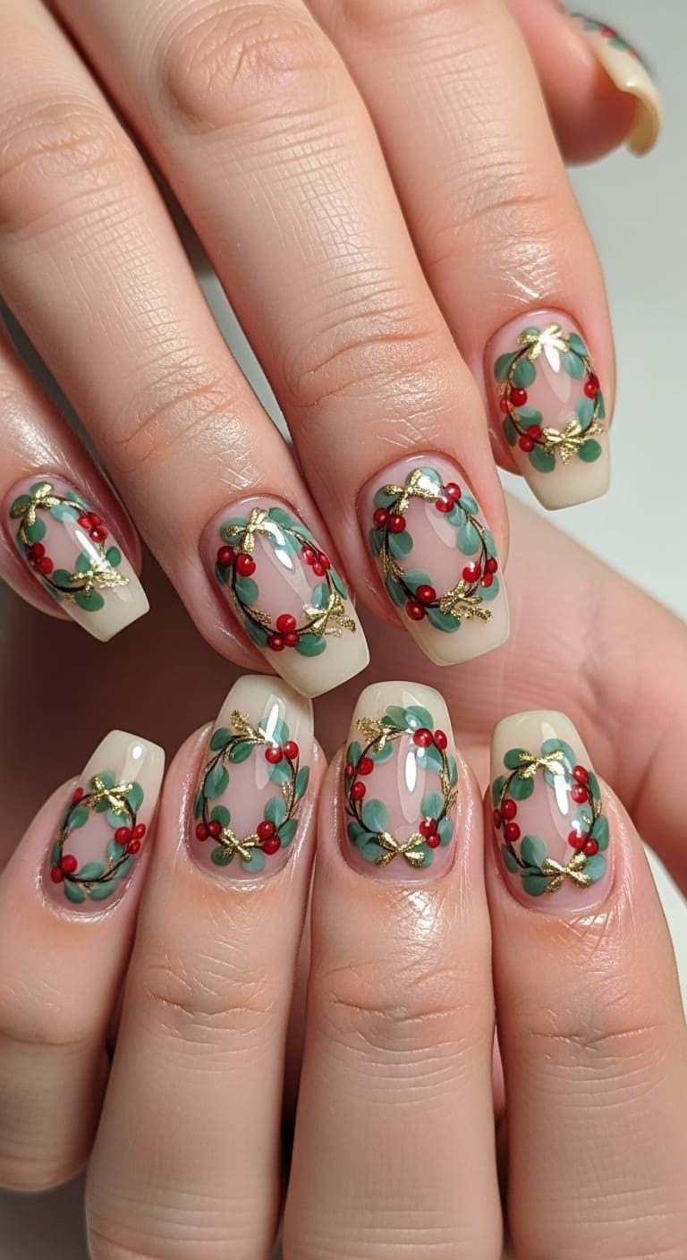 Delicate botanical designs that mimic holiday wreaths transform your nails into tiny canvases of nature-inspired art. These intricate designs feature leaves, berries, and sometimes even tiny flowers arranged in circular patterns.