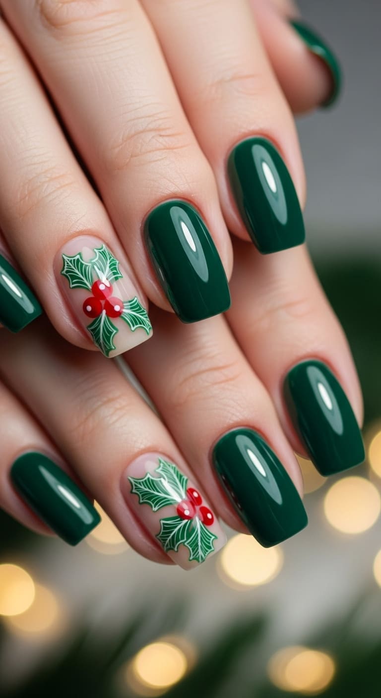 Nothing says elegant festivity quite like delicate holly berries painted on a sophisticated background. This design works beautifully when you paint most nails in a deep emerald green and reserve one or two accent nails for the holly art.