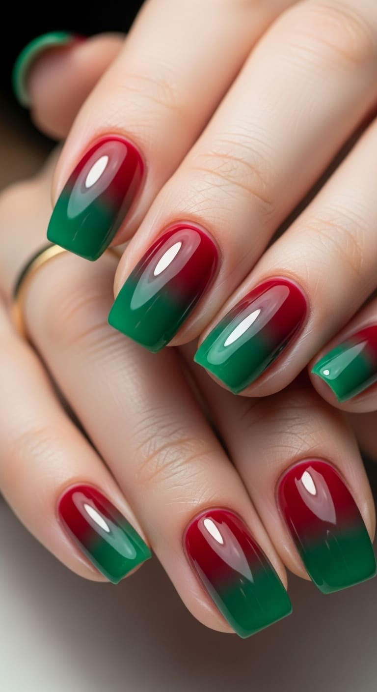 An ombre effect that transitions from deep red to lush green creates a mesmerizing sunset-like appearance on your nails. This technique involves blending the two colors seamlessly in the middle, creating that perfect gradient that looks professionally done.