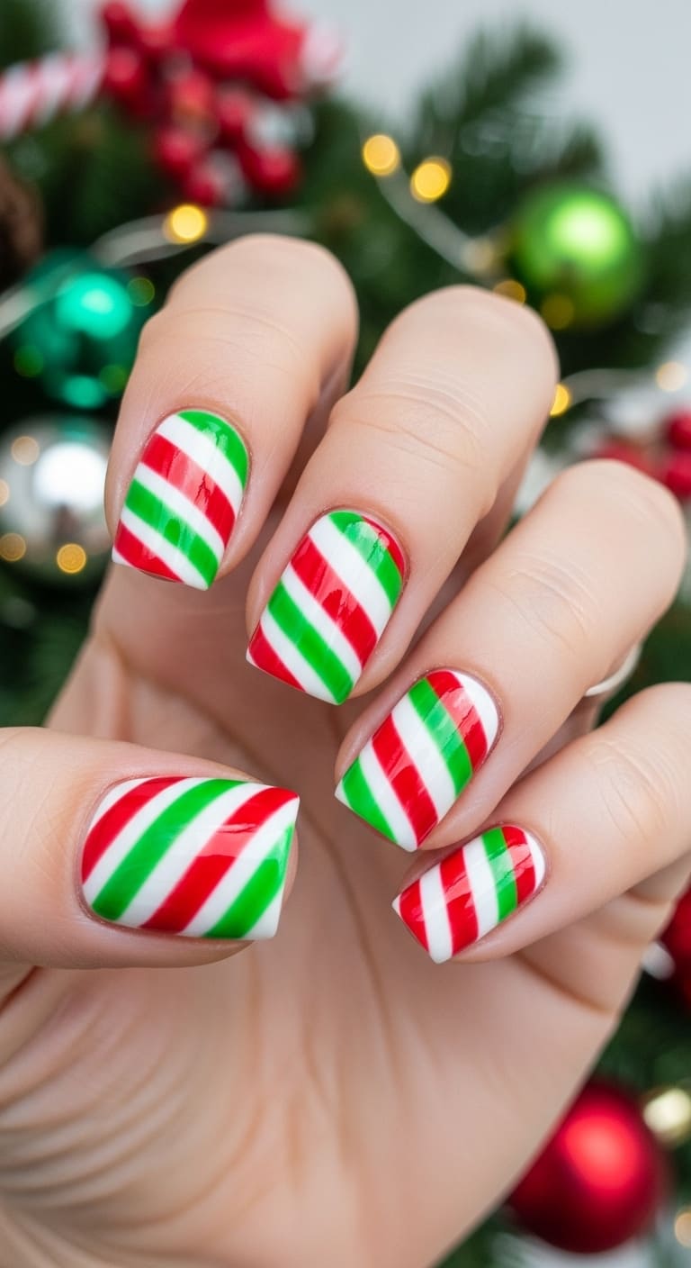 Diagonal or vertical stripes in alternating red and green give you that playful candy cane vibe with a twist. These bold stripes make a statement and are surprisingly easy to achieve with striping tape or a steady hand.