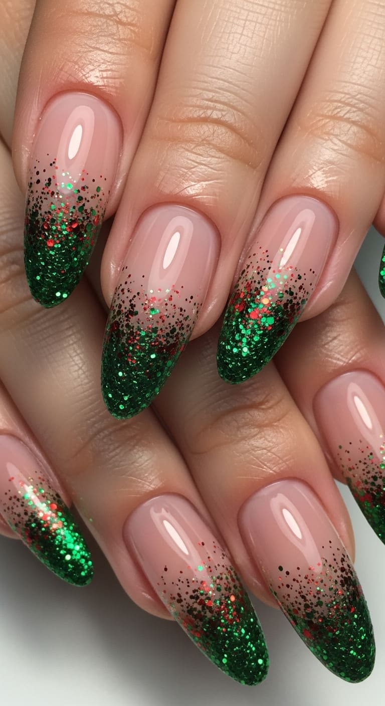 If you love a bit of sparkle, glitter gradient tips in red and green add just the right amount of glamour without overwhelming your hands. This design involves concentrating glitter at your nail tips and letting it fade toward the base for a sophisticated twinkle.