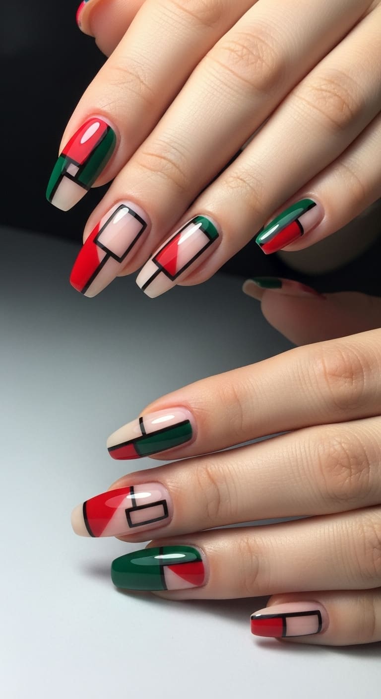 Modern geometric designs featuring bold blocks of red and green create an artistic, fashion-forward aesthetic. These angular shapes and clean lines give your manicure an editorial quality that looks incredibly chic.