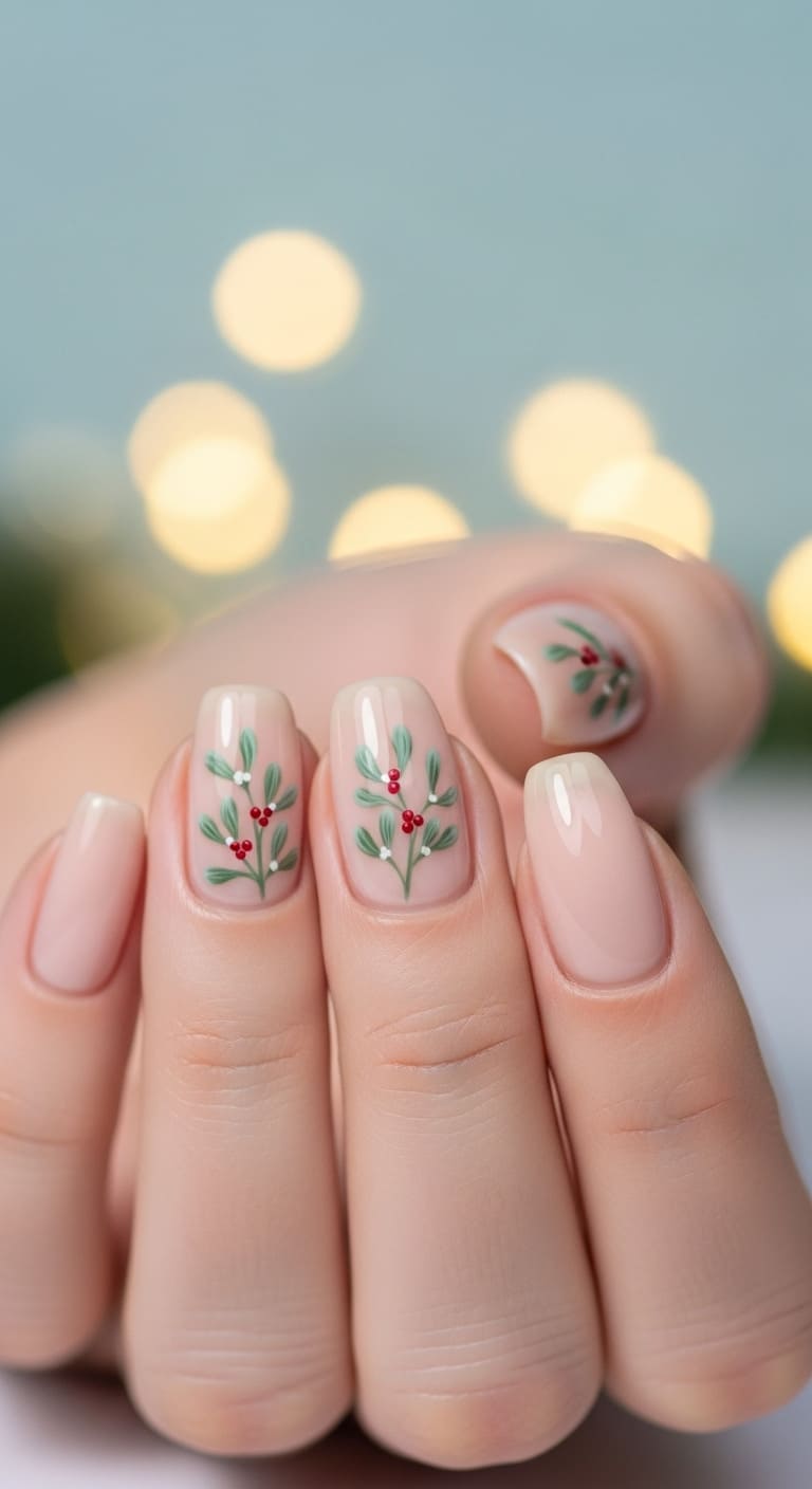 Paint your nails in a soft nude or pale pink, then add small mistletoe leaves in sage green with tiny red berries on just one or two accent nails for that subtle seasonal touch.