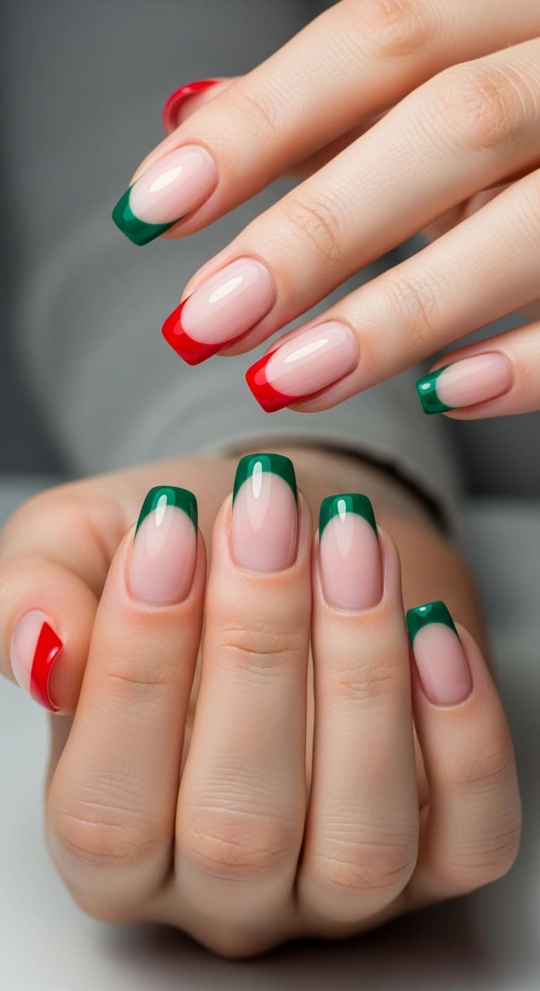 Give the classic French manicure a colorful upgrade by alternating red and green tips across your fingers. This fresh take on a timeless style feels both traditional and contemporary at once.