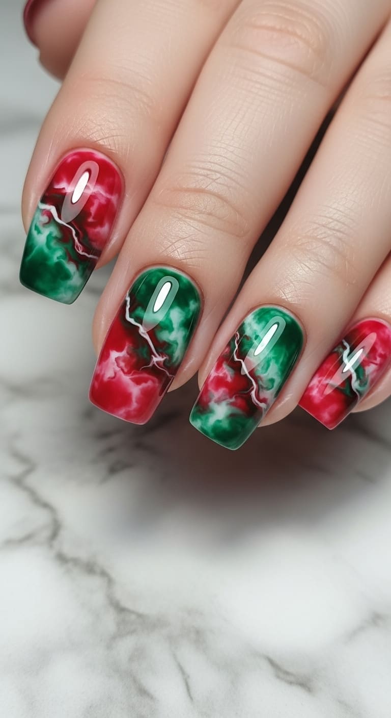 Marble effects that swirl red and green together create an artistic, one-of-a-kind appearance on each nail. This technique produces an elegant, almost luxurious finish that looks far more complicated than it actually is.