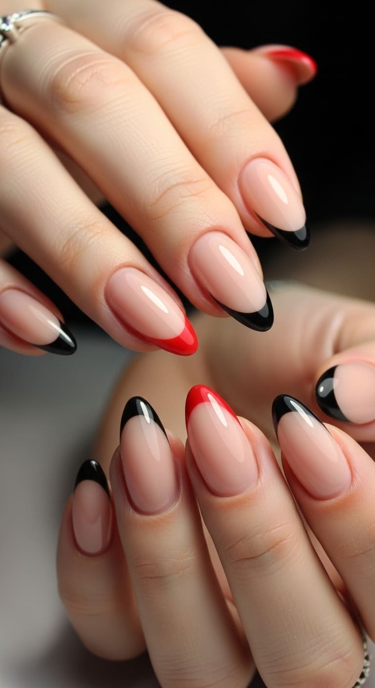 Try painting your ring finger with a full red base and a black tip, while keeping the rest of your nails with traditional white tips on a nude base, or go bold and alternate the tip colors across all ten fingers for maximum impact.