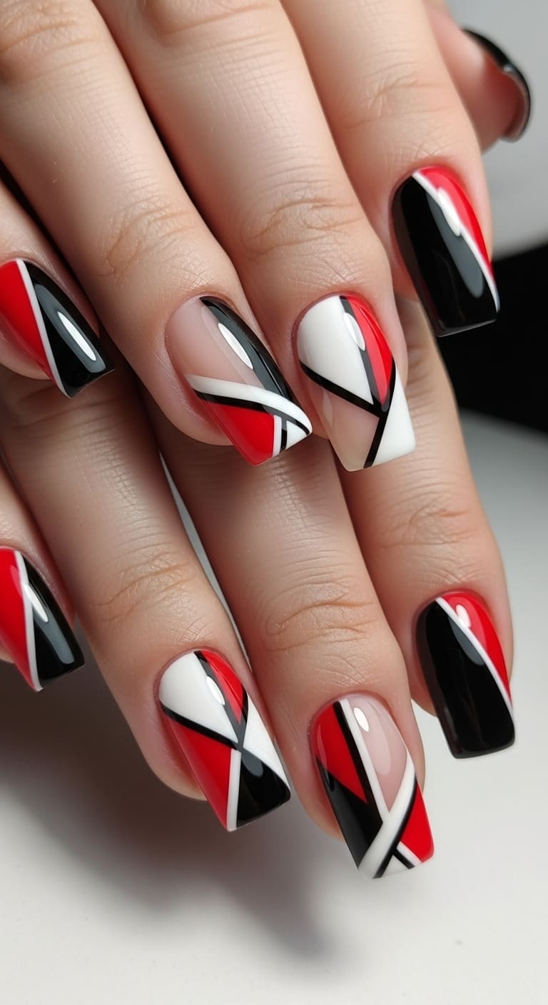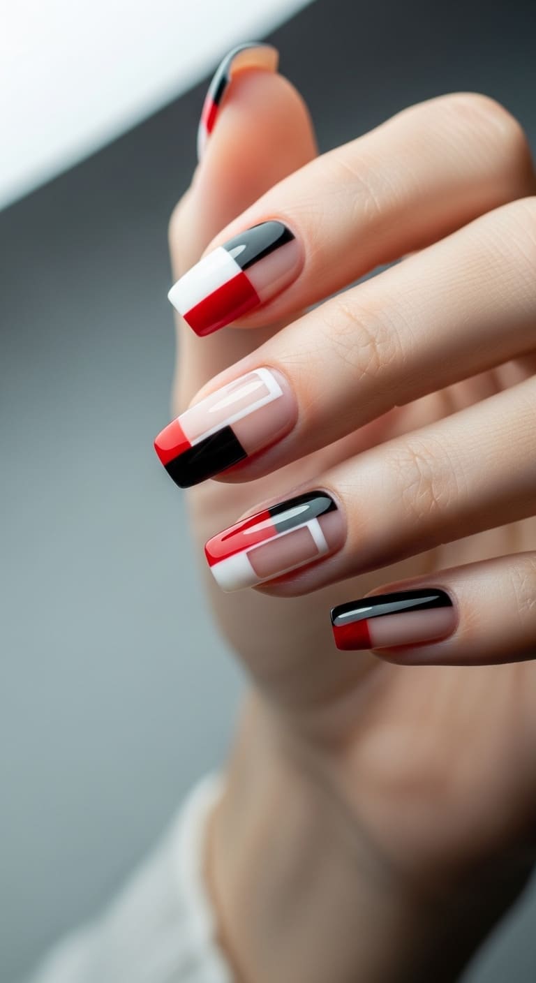 You can create triangles, rectangles, or diagonal splits—the key is keeping those lines crisp and clean. Start with a white base, add a diagonal black stripe across the middle, and fill in one corner with a vibrant red for an eye-catching asymmetrical look.