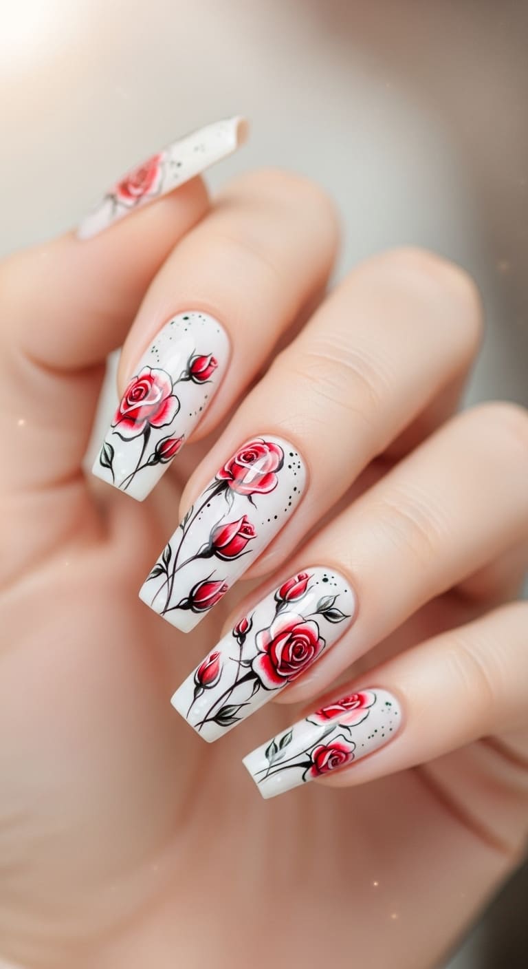 You can keep the florals simple with just a few petals and leaves, or go elaborate with full bouquets spanning multiple nails—either way, this feminine design proves that red, black, and white can be sweet and sophisticated.
