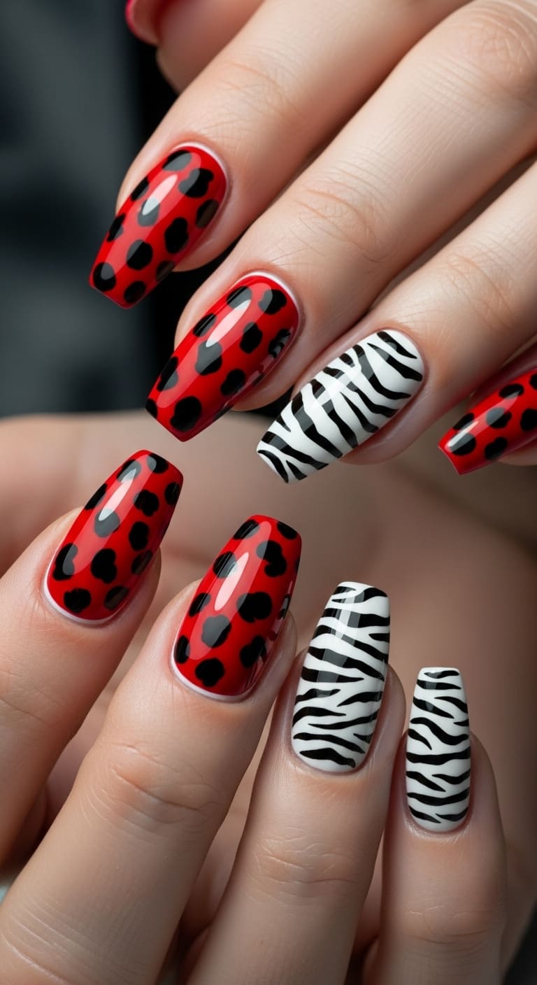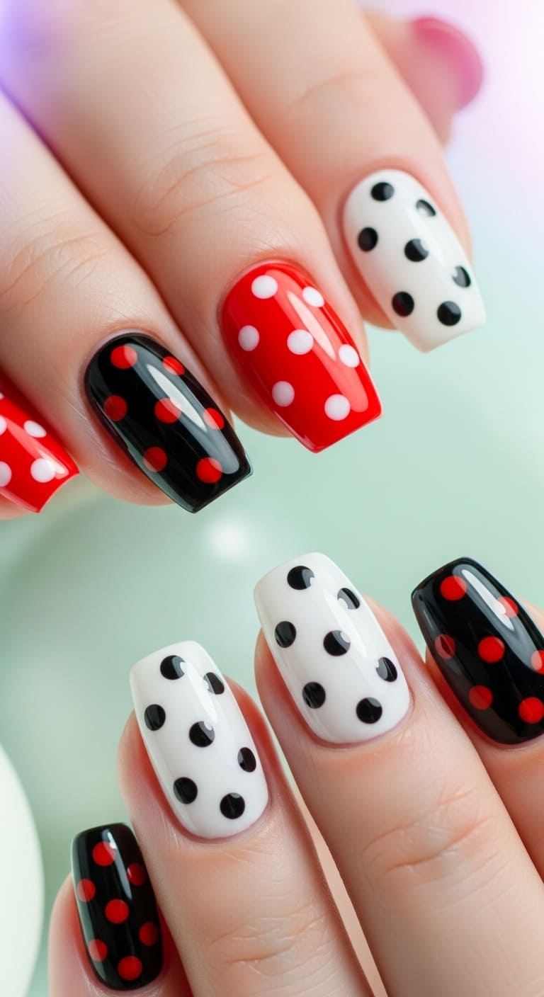 A black base with white polka dots feels retro and chic, while white nails with red dots give off playful, feminine vibes. Mix and match your dot patterns across different fingers, or keep it uniform for a cohesive, polished appearance.