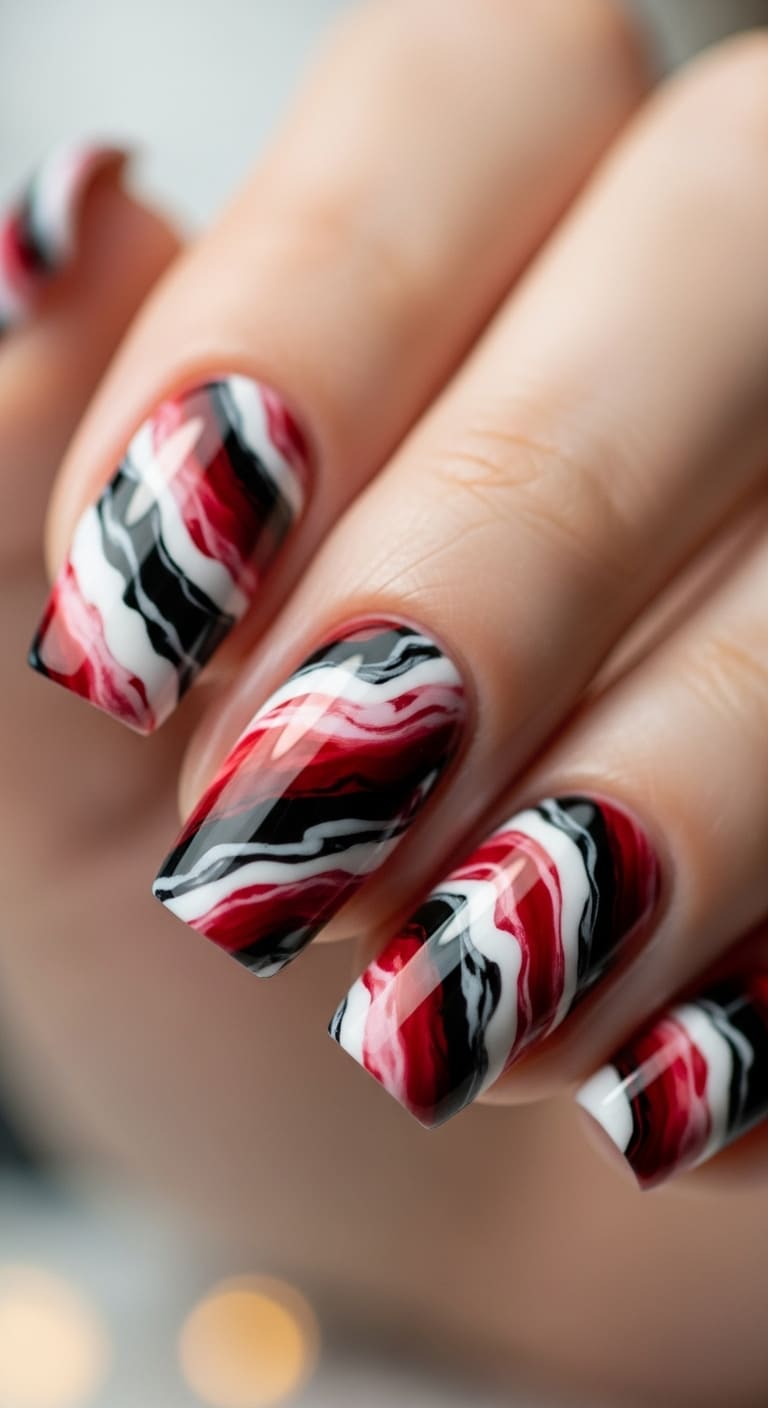 Red and black veining through a white base creates a luxurious, almost gemstone-like effect that’s perfect for special occasions. Try this technique on just your ring fingers while keeping the other nails a solid complementary color, or go all-in with marbled masterpieces on every nail.