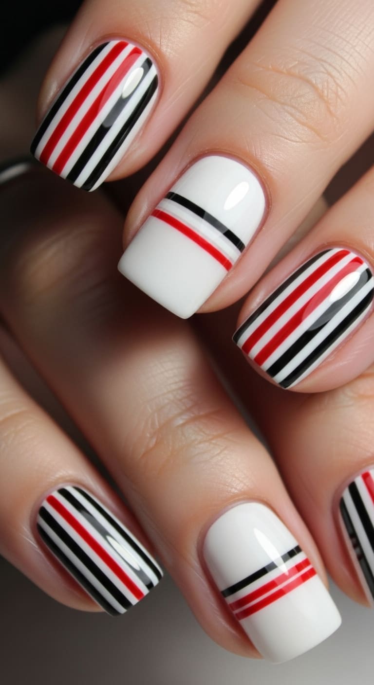 Use striping tape or a fine liner brush to create thin black lines on a white base, or alternate thick red and white stripes on a black background for a bold, graphic statement that photographs beautifully.