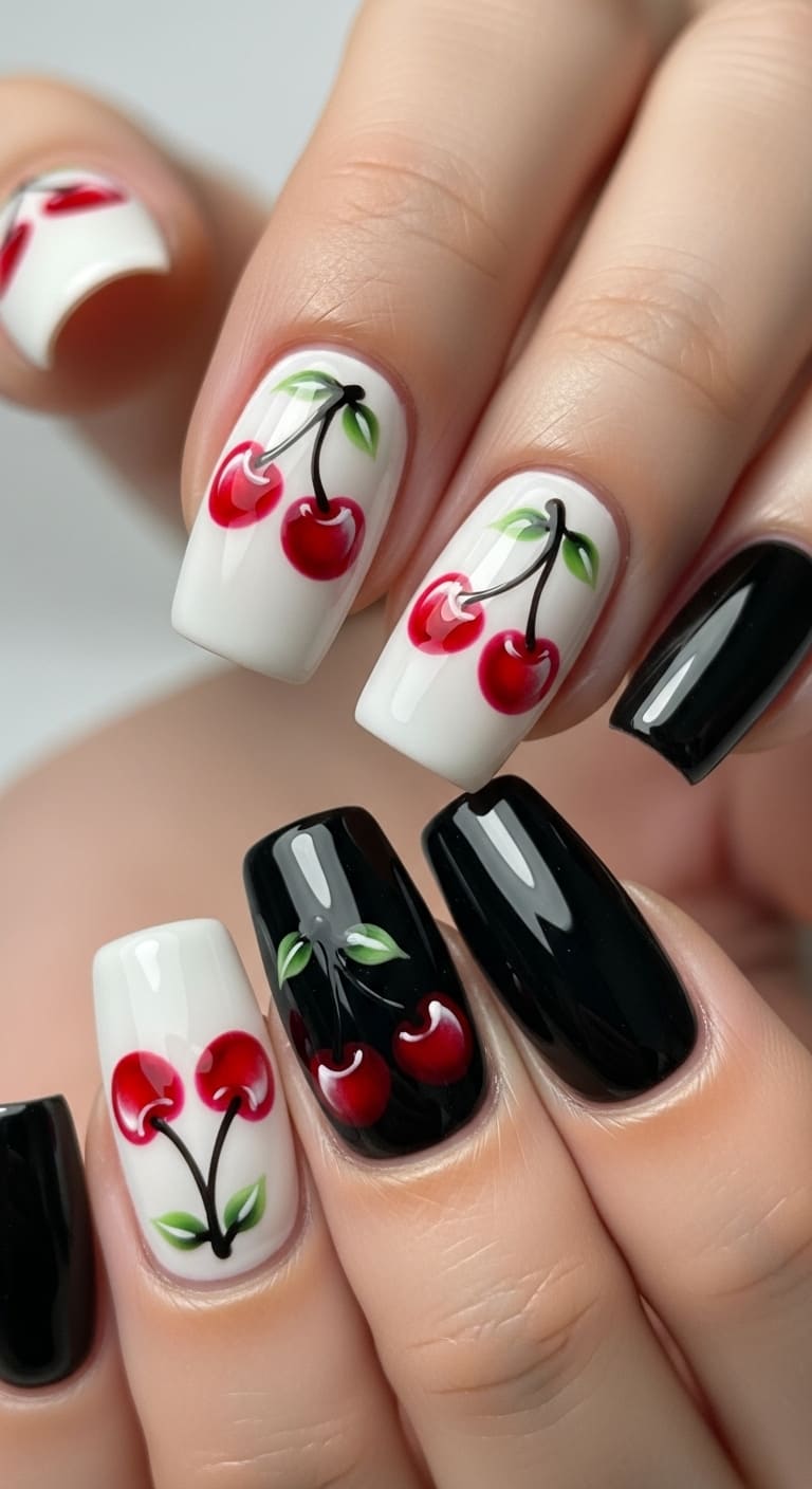 Tiny cherry designs perfectly showcase all three colors while adding a playful, retro element to your nails. Paint your nails white or black as a base, then add small red circles for the cherries with black stems and white highlights for dimension.
