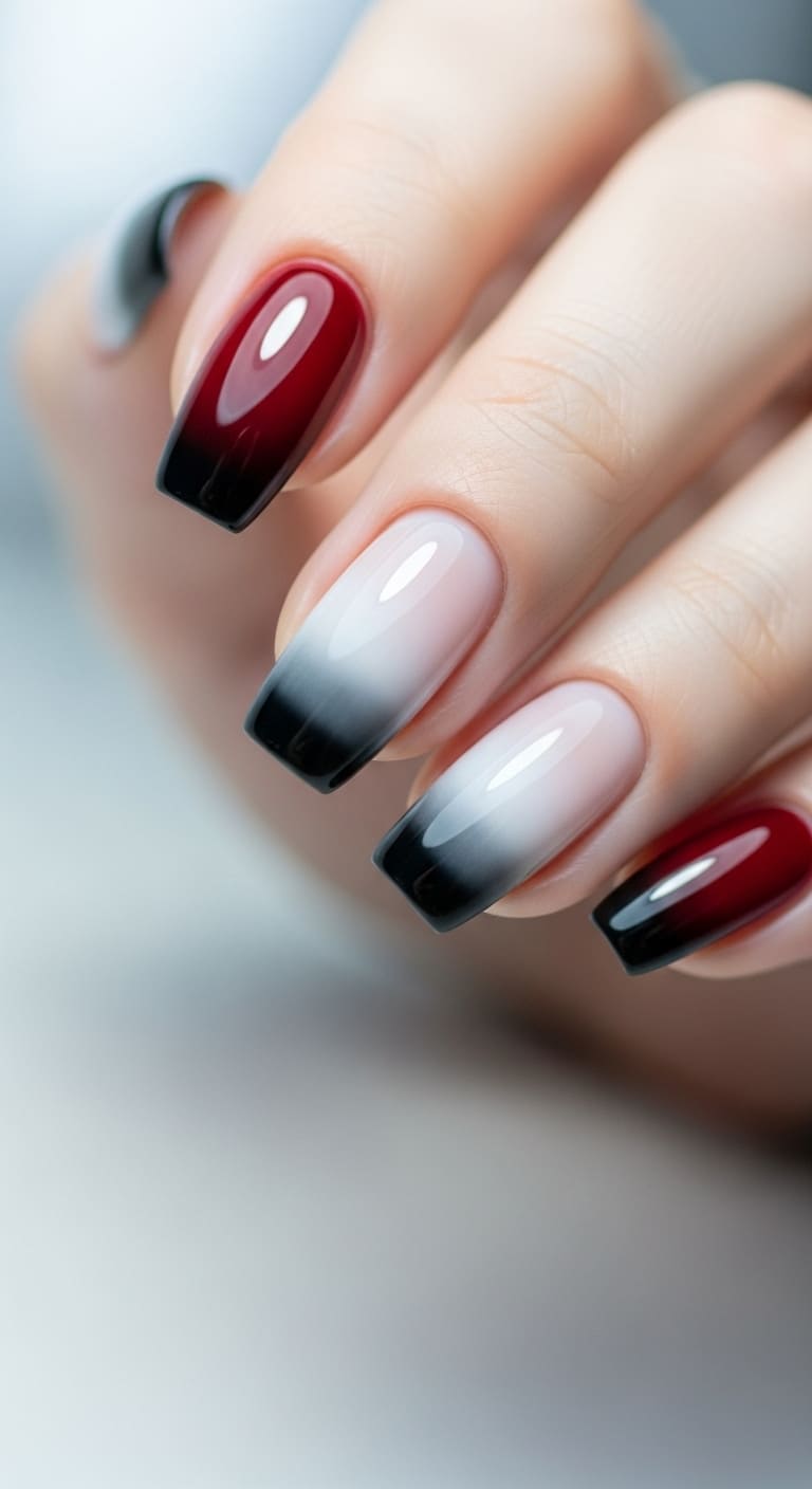 Gradient nails create a soft, dreamy transition between your chosen colors that feels both modern and romantic. You can fade from red to black, white to red, or even create a three-color gradient from white through red to black.