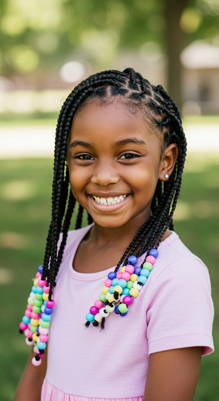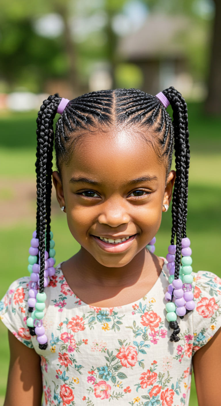 Choose two to three complementary bead colors and place them at the ends of each braid for a uniform look. This playful style stays in place during active play and makes morning routines a breeze.