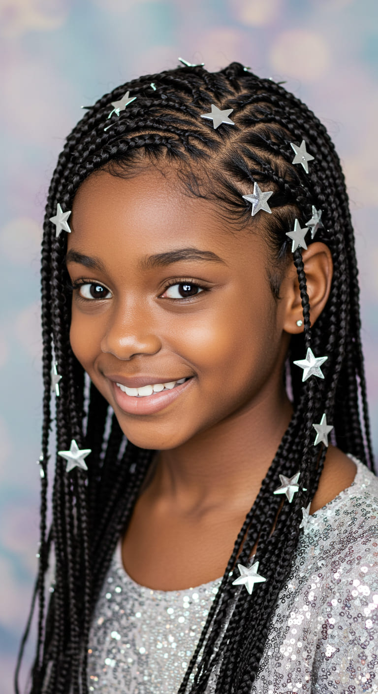 Side-swept braids are effortlessly stylish and even more dazzling when adorned with silver star beads. The asymmetrical look frames the face nicely and gives a modern twist to traditional braids.