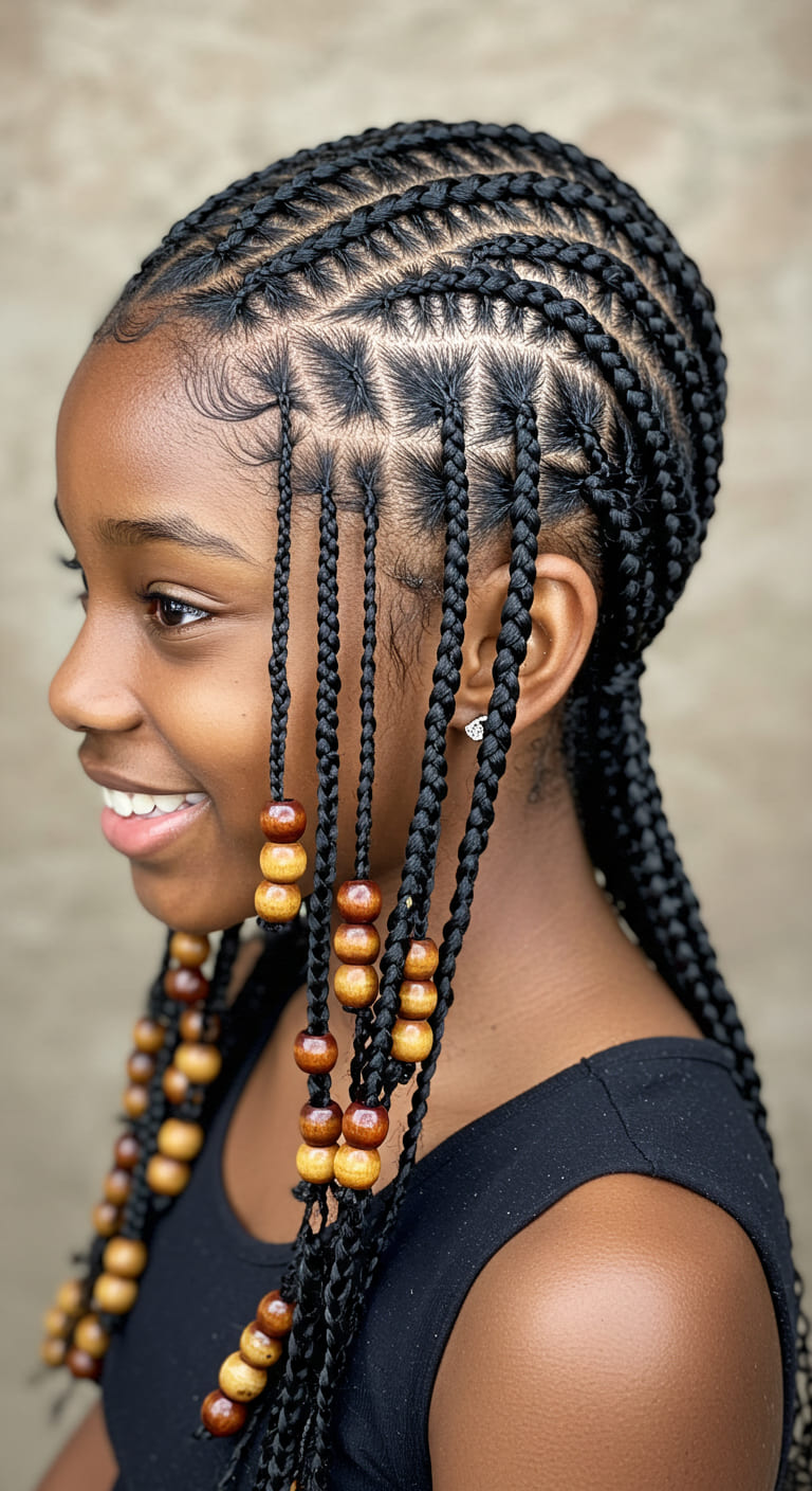 Choose warm-toned beads like mahogany, amber, or caramel for an authentic finish. This style works well with afro-puffs or ponytails at the back.