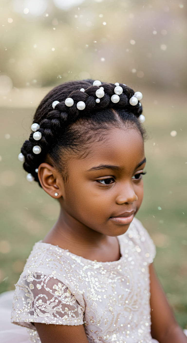 Make your little one feel like royalty with a crown braid wrapped around the head and dotted with delicate pearl beads. This elegant style is ideal for weddings, holidays, or dress-up days.