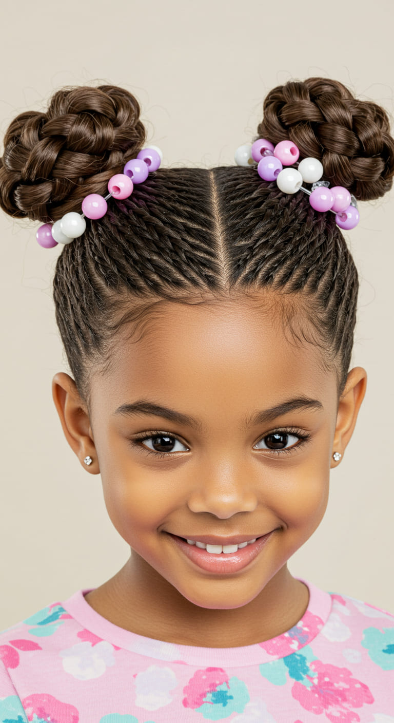 Braided double buns are both cute and practical, especially when each braid is finished with matching beads.