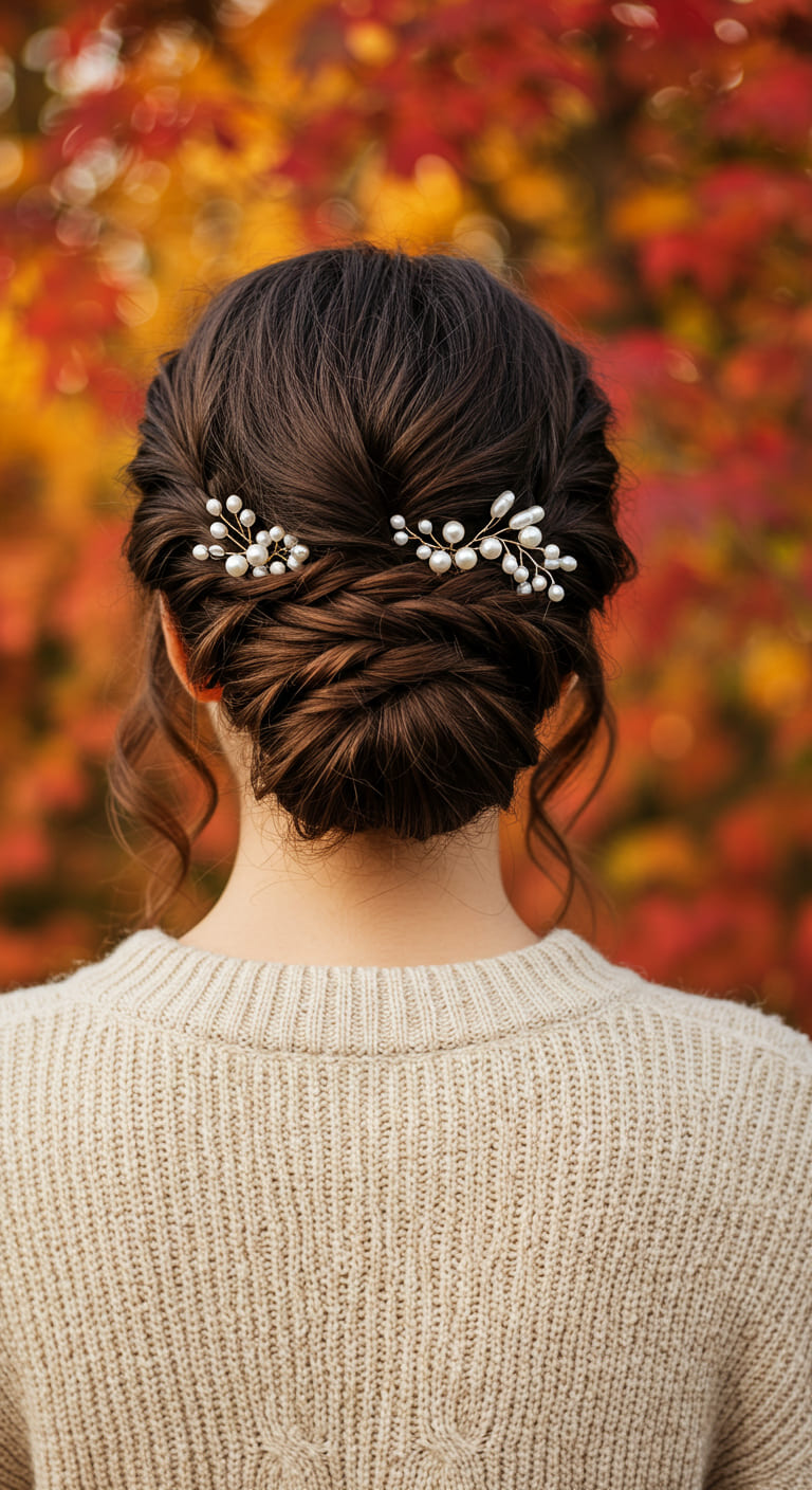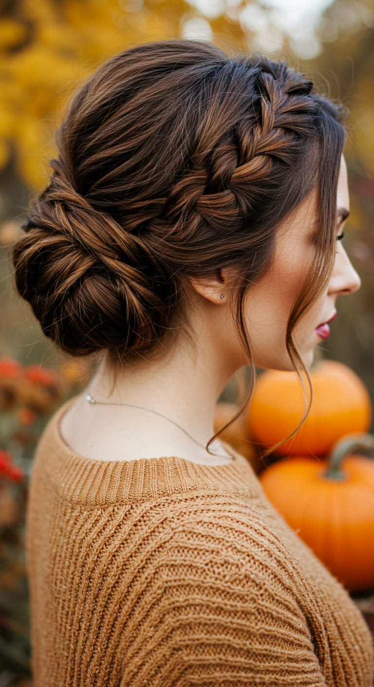 Start with a side French braid that leads into a low bun for a romantic fall updo. This style keeps hair secure and stylish at the same time.
