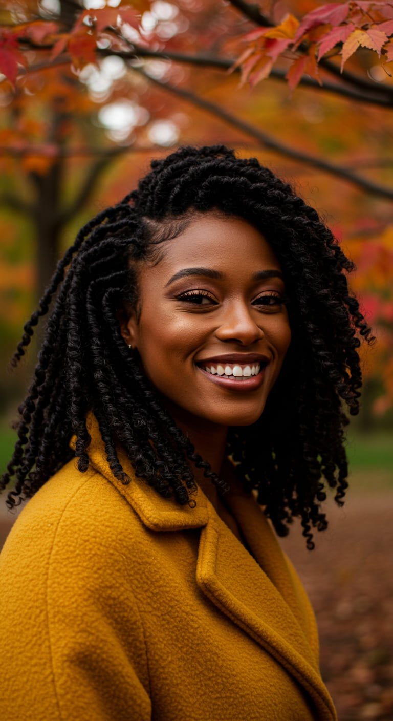 Combine elegance and coziness with this twisted low bun. Start with a simple braid, then wrap it into a bun at the nape of your neck. It holds up well against fall wind and looks polished for everything from errands to autumn weddings.