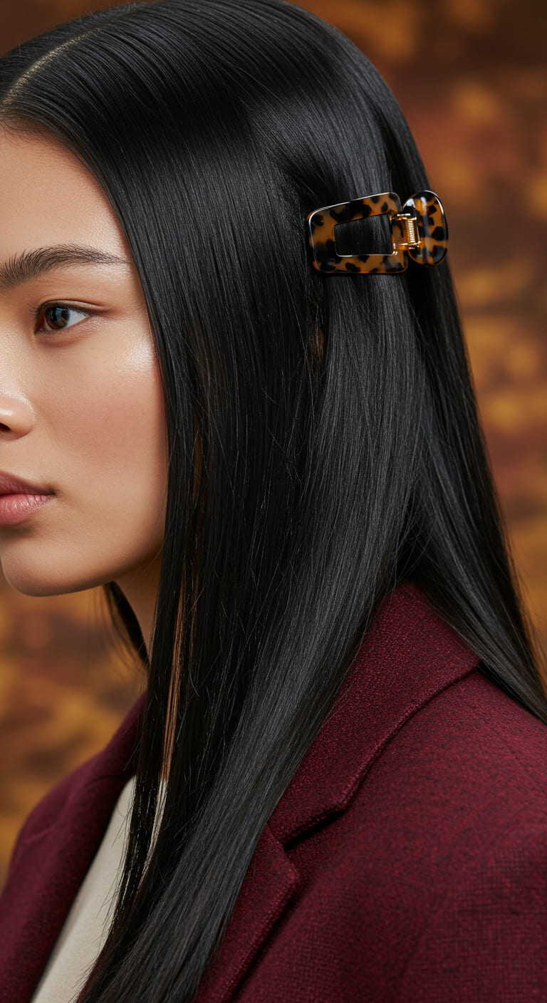 For a minimalist yet fashionable look, go for pin-straight hair with a center part. Add a bold statement clip—like tortoiseshell, gold, or maroon—for a seasonal pop.