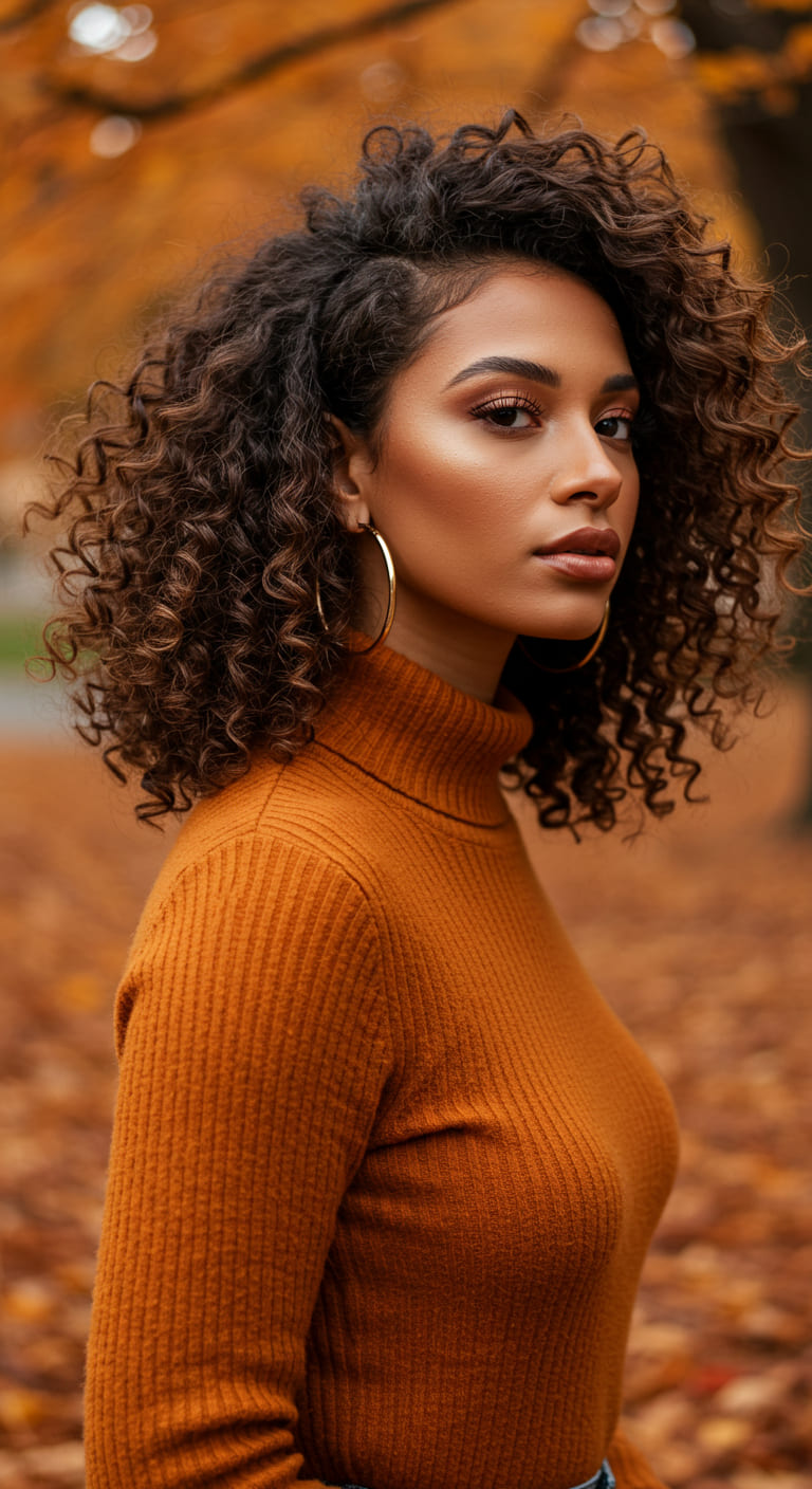 Big, side-swept curls add volume and drama to your autumn look. Whether your hair is naturally curly or you use a curling wand, this style pairs beautifully with cozy scarves and layered outfits.