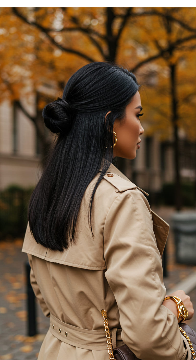 Clean, elegant, and perfect for chilly fall mornings. This sleek style works especially well for medium to long hair and can be worn to work or formal events.