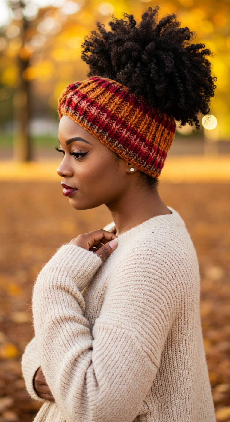 This natural hair look celebrates volume and texture. Gather your curls into a high puff and accessorize with a thick, cozy headband.