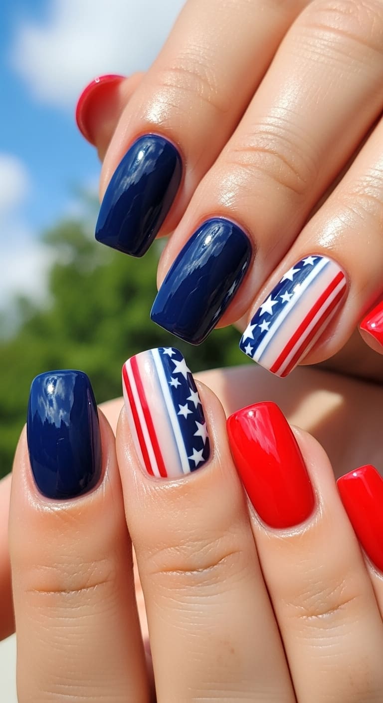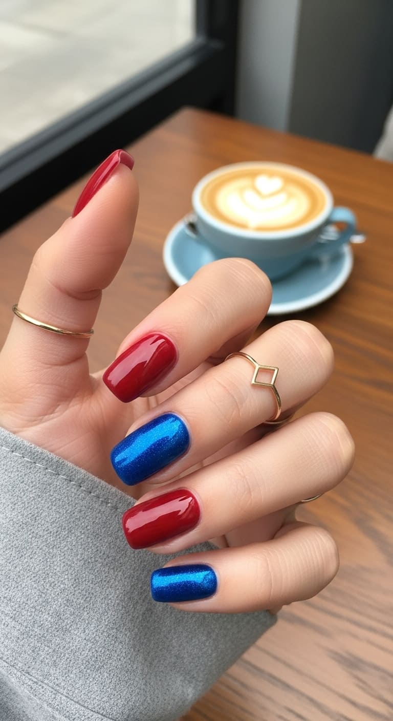 Paint two or three nails in a deep crimson red and the remaining nails in a rich cobalt or navy blue. For a subtle twist, choose different finishes—maybe a creamy red paired with a shimmery blue, or a matte blue alongside a glossy red for added dimension.