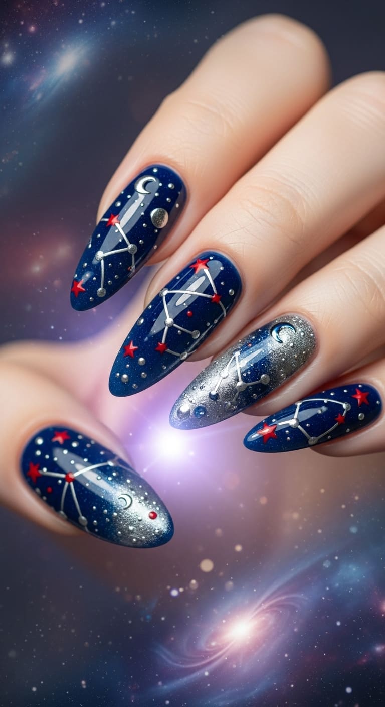 Apply two coats of navy or midnight blue as your base, then use a thin nail art brush or dotting tool to add small red stars, planets, or constellation patterns.