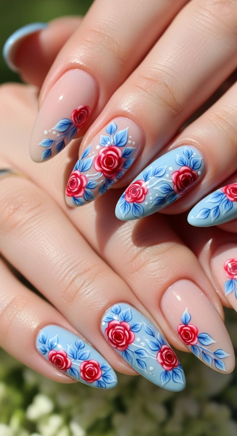 Paint your base in a soft nude, white, or even pale blue, then add small red roses or poppies with blue leaves and accents.