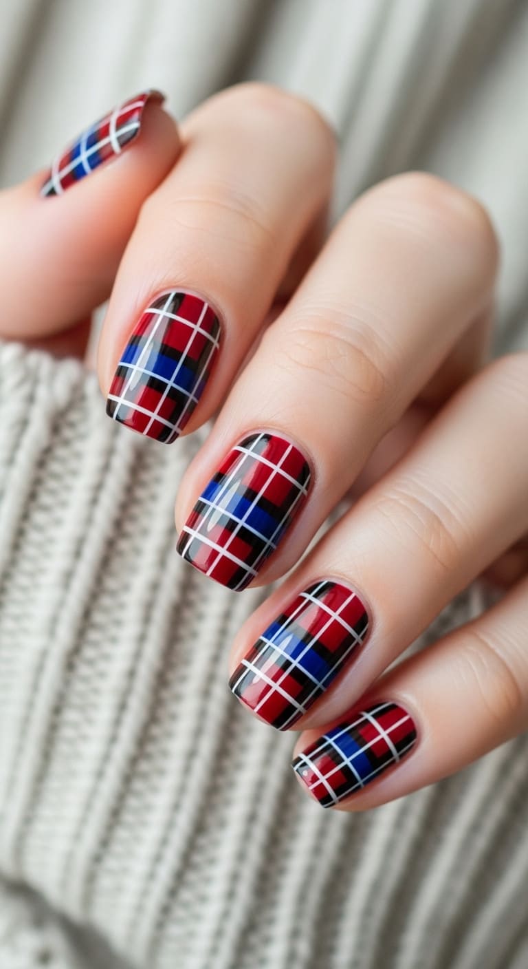 Plaid brings a cozy, slightly preppy energy to your blue and red manicure that’s perfect for fall and winter months. The intersecting lines create visual interest while the familiar pattern makes this bold color combo feel surprisingly accessible and wearable.