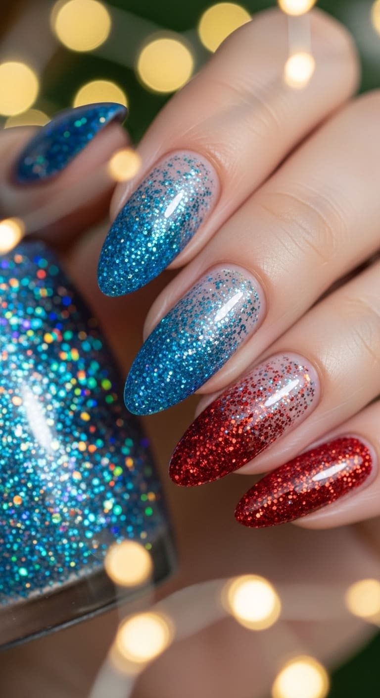 Apply a clear or nude base, then use a makeup sponge to dab on blue glitter at your cuticles and red glitter at your tips, blending where they meet. Chunky holographic glitters in these shades work beautifully for festival season, while fine micro-glitters keep things elegant for formal events.